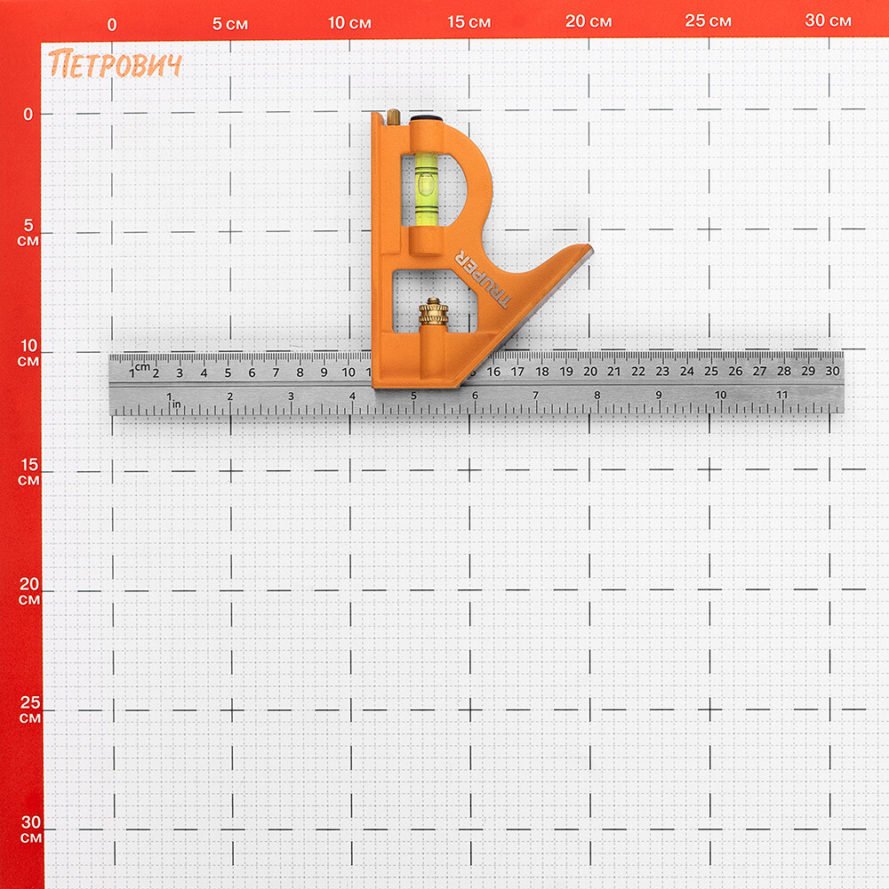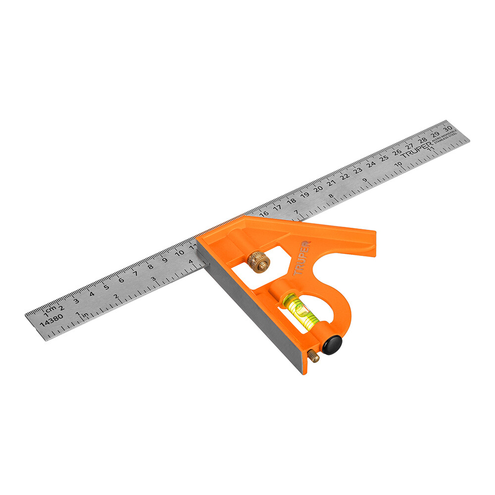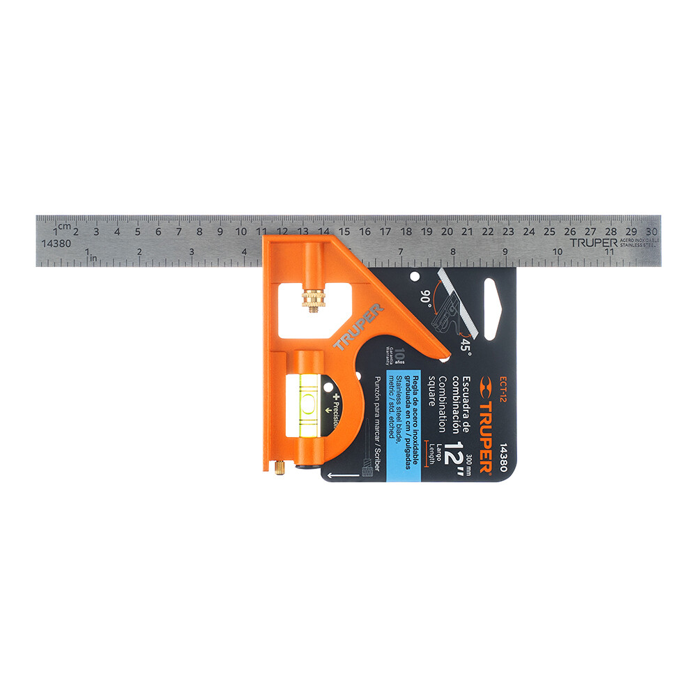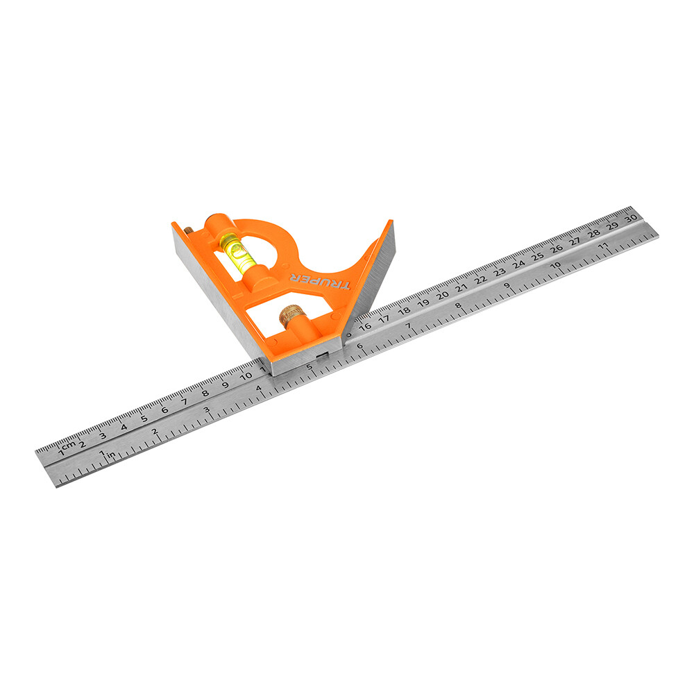 Встроенный уровень, чертилка, углы 90 и 45, полотно из нержавеющей стали с гравировкой метрической и дюймовой шкалы, корпус из алюминия.