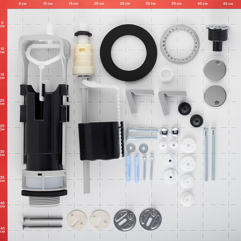 В комплектацию входит: Чаша напольная, бачок, сиденье дюропластовое с функцией мягкого закрывания и быстрого снятия, арматура двухрежимная, комплект креплений, инструкция, гарантийный талон