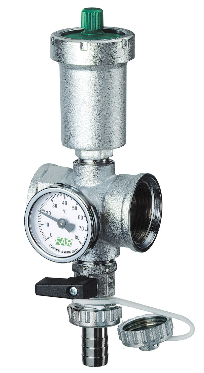 Предназначен для монтажа на коллекторные группы. Состоит из хромированного переходника, автоматического воздухоотводчика, который удаляет излишки воздуха из системы, термометром (0-120°C) и сливным краном, на концах которого имеются штуцер для подключения шланга и заглушка. Снабжён пластиковой ручкой для защиты от ожогов.
