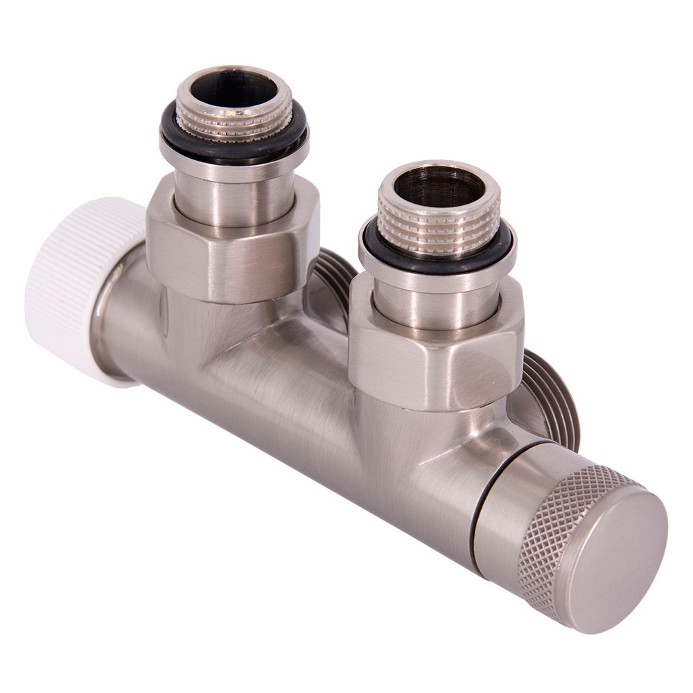 Узел SR Rubinetterie угловой для нижнего подключения радиаторов — вентиль на подачу термостатический, с механизмом предварительной настройки и запорный клапан. Межосевое расстояние 50 мм, соединение для медных труб или многослойных труб, резьбовые переходники для подключения к радиатору с герметичной прокладкой.