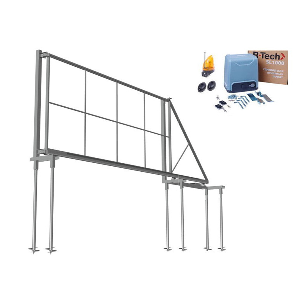 Каркас рамы откатных ворот изготовлен из профильной трубы 60х30х1,5 мм., с внутренним усилением из профильной трубы 20х20х1,5 мм. Несущая конструкция ворот (предназначена для удержания каркаса ворот в вертикальном положении), представляет собой два столба из профильной трубы 80х80х2050 мм с установочными пластинами 150х150х3 мм., грунт серый. Комплект фундамента на винтовых сваях-стойках, швеллер. Автоматика для автоматизации открытия/закрытия ворот: R-Tech SL1000AC KIT для откатных ворот весом до 1000кг и зубчатая рейка (5м). Каркас ворот с направляющим рельсом Ролтек Микро, роликовая система Ролтек. Несущие столбы из профильной трубы 80х80х2050 мм. (толщина 2 мм.) с пластиной 150х150х3 мм.,грунт серый (2 шт.). Рейка зубчатая 30х8 длина 1 м 262-30×8 с крепежем для автоматизации ворот (5 шт.). Комплект автоматики R-Tech SL1000AC KIT для откатных ворот весом до 1000 кг.