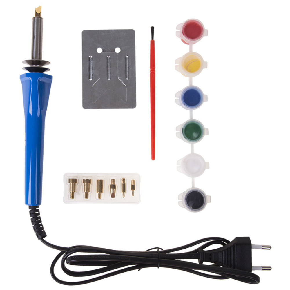 Комплектация: Паяльник, жало для пайки, выжигательные насадки — 6 шт., краски — 6 шт., металлическая подставка и кисточка.