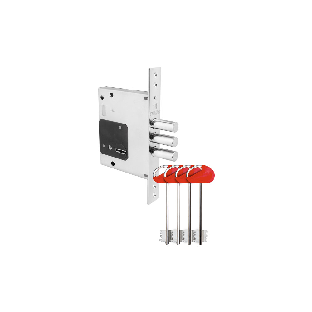 В комплект входят 4 замковых ключа с эргономичной пластиковой головкой для дверей толщиной 40 — 120 мм, крепежная фурнитура.