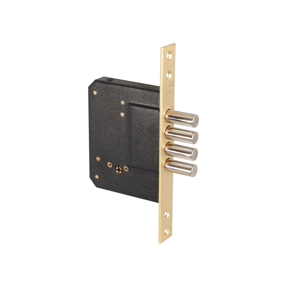 Врезной замок Fuaro с крестовым цилиндровым механизмом и 4 ригелями. Подходит для установки на деревянные и легкие металлические двери. Секретность замка составляет 55 000 комбинаций. Вылет ригеля — 27 мм. Бэксет — 50 мм. Ширина лицевой планки — 22 мм.