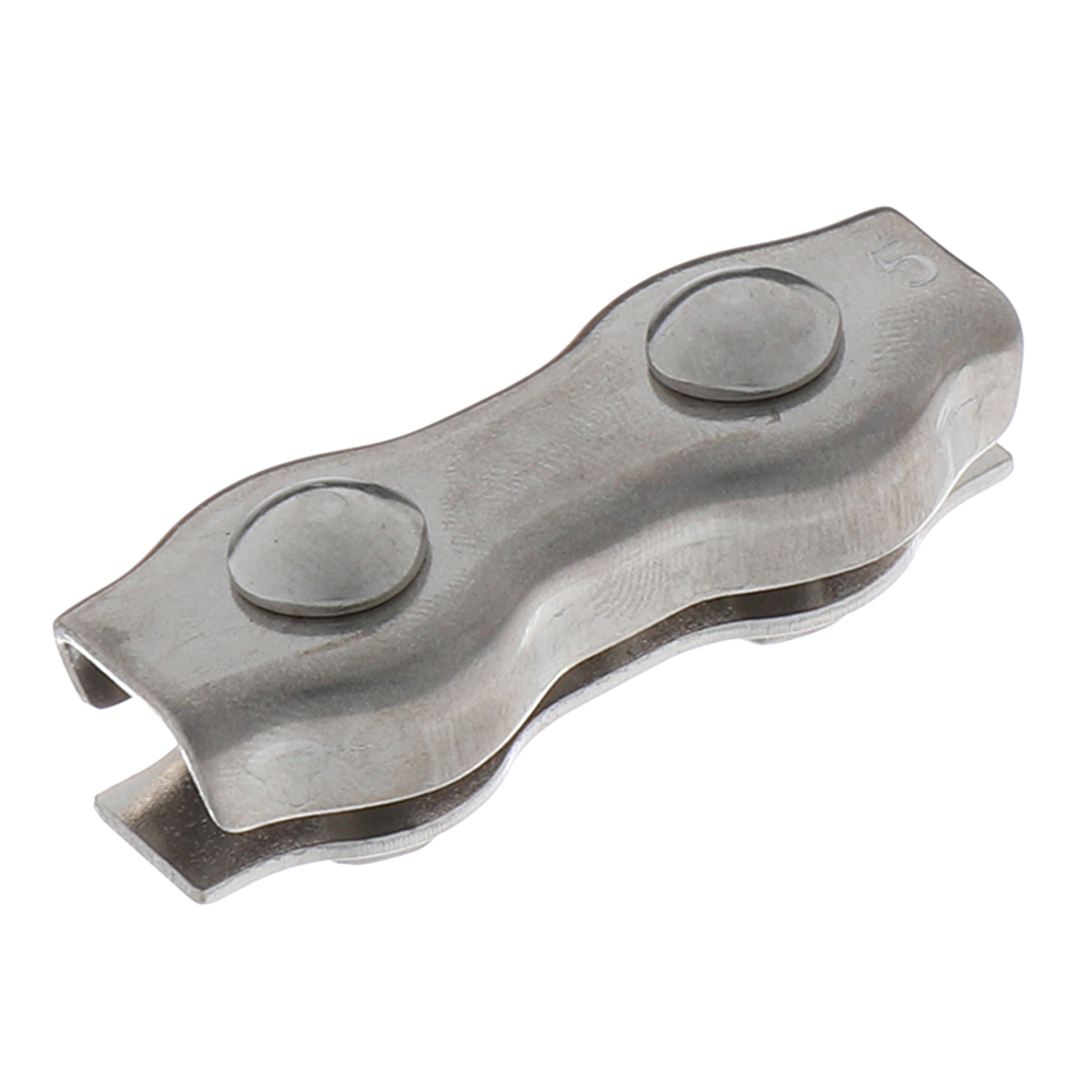 Зажим Duplex для сращивания стальных тросов, канатов размером 5 мм. Также он применяется для создания петель на концах тросов. Двойной зажим Duplex гораздо прочнее при сращивании одинарного Simplex. Независимо от типа, рекомендуется устанавливать не менее двух стальных зажимов.
