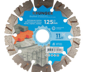 Первоначальная цена составляла 7856 ₽.7627 ₽Текущая цена: 7627 ₽.шт.Диск алмазный по бетону Kronger Bullet 125х22,2х2,3 мм сегментный сухой рез (B200125B)