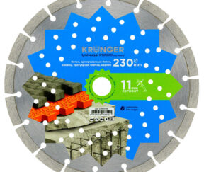 Первоначальная цена составляла 3193 ₽.3100 ₽Текущая цена: 3100 ₽.штДиск алмазный по бетону Kronger Universal 230х22,2х2,5 мм сегментный сухой рез