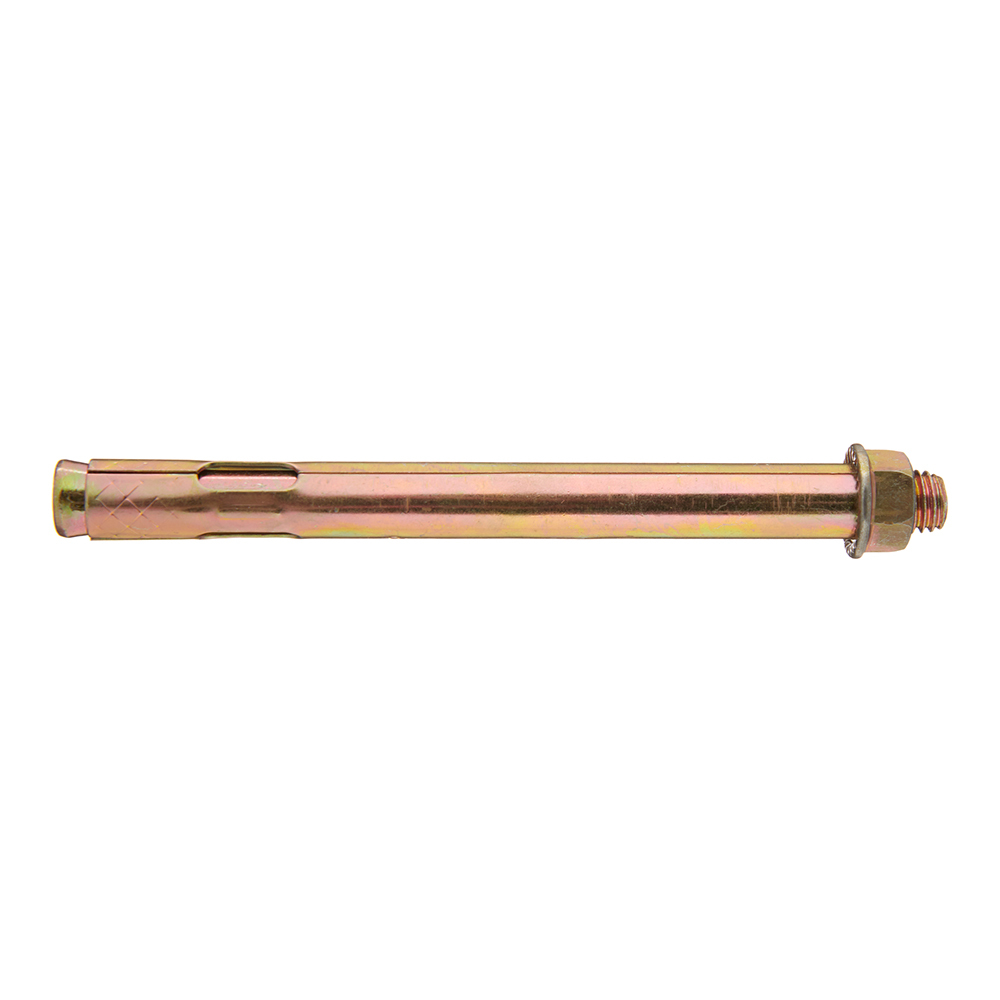 Оцинкованное покрытие обеспечит защиту от коррозии. Анкерный болт с гайкой (втулочный анкер) оснащен фиксирующей гильзой, длина которой равна размерам стального стержня. На хвостовой части шпильки выполнена клинообразная головка. При завинчивании гайки она смещается по резьбовой части. В результате перемещения происходит распирание втулки. Конструктивные особенности такого вида крепежа позволяют использовать его в легких видах бетонов с ячеистой структурой, а также в кирпиче, изготовленном из обожженной глины.