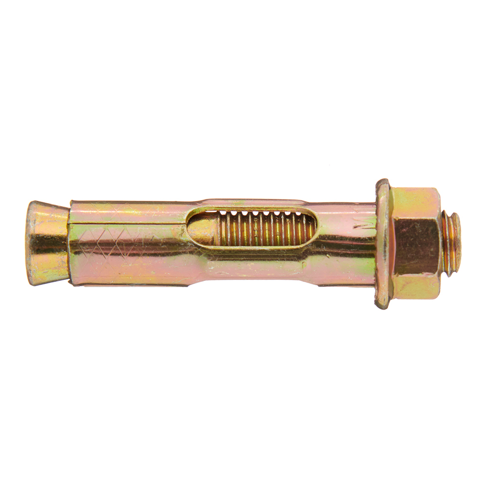 Оцинкованное покрытие обеспечит защиту от коррозии. Анкерный болт с гайкой (втулочный анкер) оснащен фиксирующей гильзой, длина которой равна размерам стального стержня. На хвостовой части шпильки выполнена клинообразная головка. При завинчивании гайки она смещается по резьбовой части. В результате перемещения происходит распирание втулки. Конструктивные особенности такого вида крепежа позволяют использовать его в легких видах бетонов с ячеистой структурой, а также в кирпиче, изготовленном из обожженной глины..