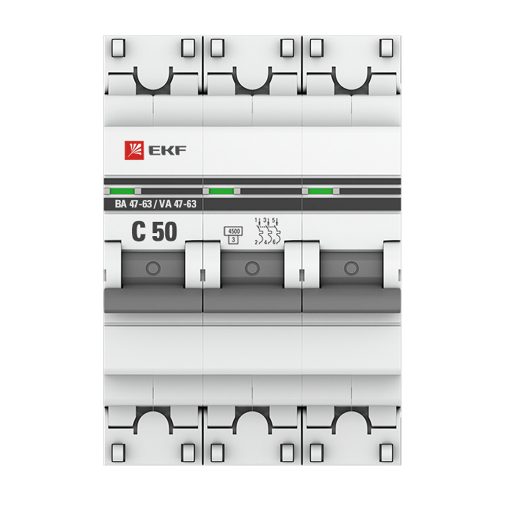 Автоматический выключатель модульный EKF PROxima ВА 47-63 3Р 50А тип C 4,5 кА 400 В (mcb4763-3-50C-pro)