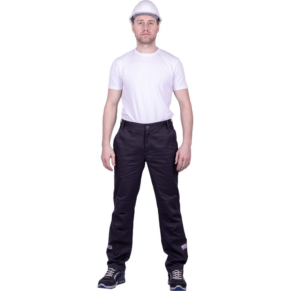 Брюки прямого силуэта, с притачным поясом, с семью шлевками. Нижняя боковая часть брюк со световозвращающей термоклеевой полосой.