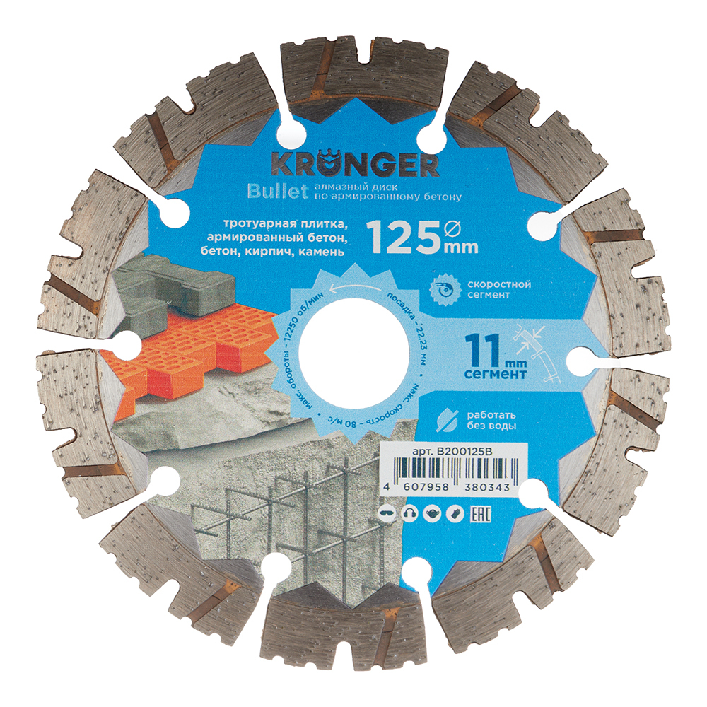 Диск алмазный по бетону Kronger Bullet 125х22,2х2,3 мм сегментный сухой рез (B200125B)