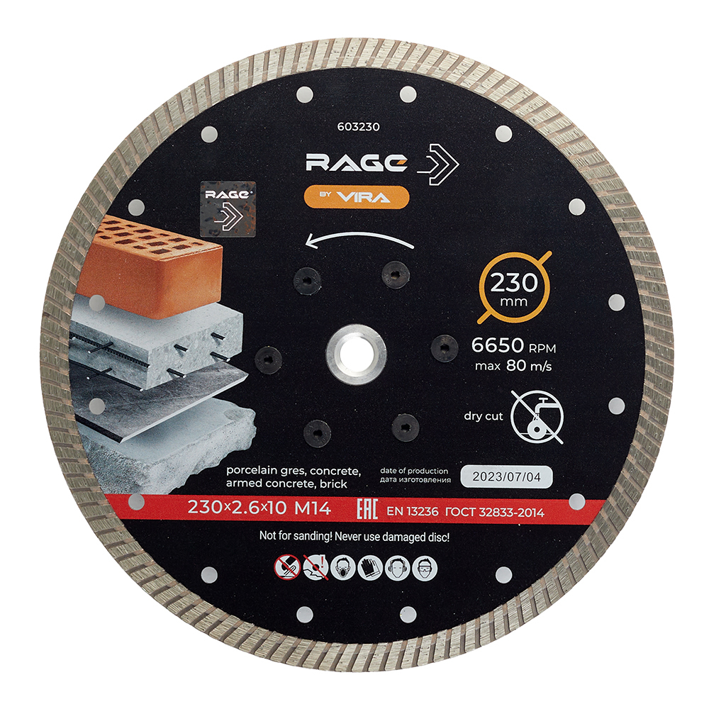 Диск алмазный по бетону Rage by Vira 230х22,2х2,4 мм турбо с фланцем М14 сухой рез (603230)