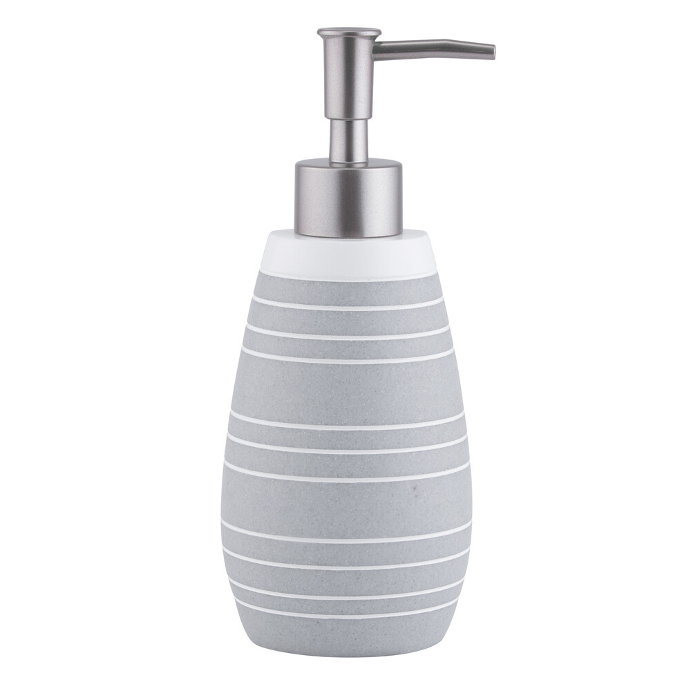 Дозатор Granit объемом 340 мл имеет округлую мягкую форму и фурнитуру цвета матового серебра. Аксессуар приятен на ощупь, потому что материал полирезин имеет низкую теплопроводность. Входит в состав коллекции Granit.