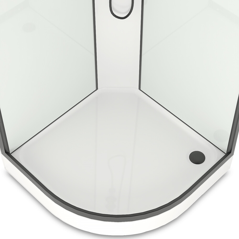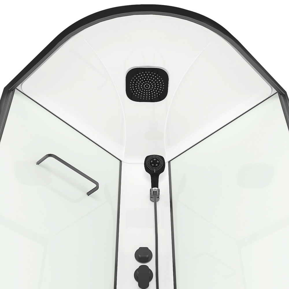 Поддон акриловый в комплекте с каркасом и экраном, комплект стекол, комплект стенок, крыша, верхний тропический душ, ручная лейка, держатель ручной лейки с регулировкой наклона, смеситель с металлическим ручками, полочка для мыльных принадлежно…