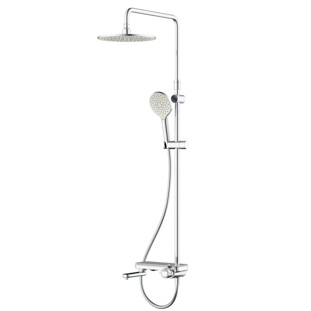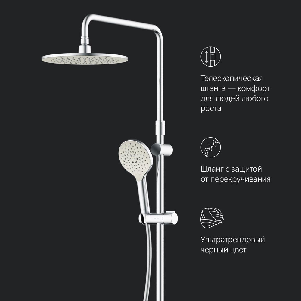 Смеситель выполнен в виде полочки. Увеличенный диаметр душевых леек (верхний душ 220 мм и ручной душ 120 мм) позволит ощутить преимущества тропического душа, тогда как увеличенная длина шланга 1750 мм обеспечит свободу движений во время принятия душа. Телескопическая поворотная штанга регулируется по высоте в диапазоне от 1030 до 1460 мм обеспечивая комфорт для людей любого роста, а шаровой шарнир в держателе верхнего душа позволяет регулировать угол его наклона. Переключатель расположен за ручкой настройки температуры и позволяет менять источник потока воды от ручной лейки и излива до верхнего душа.