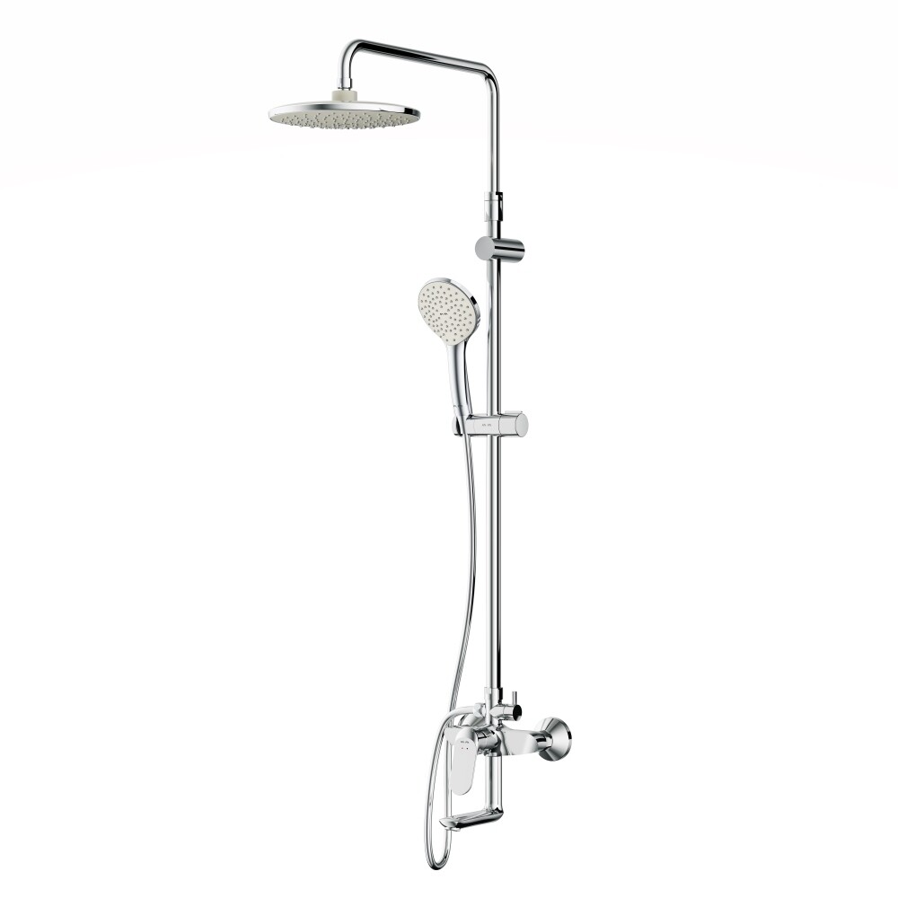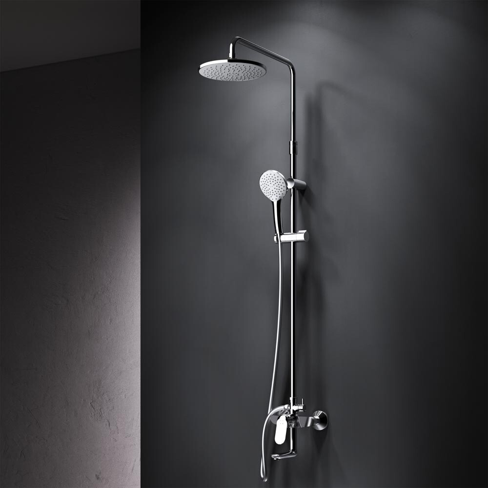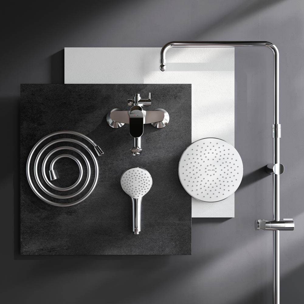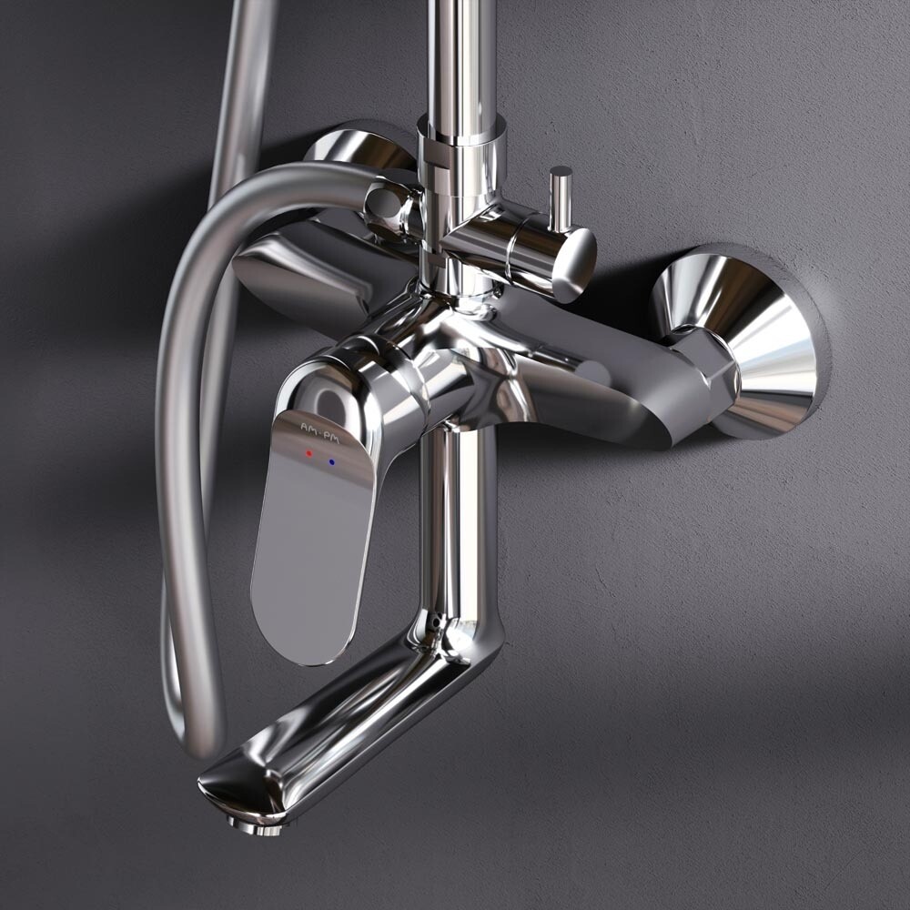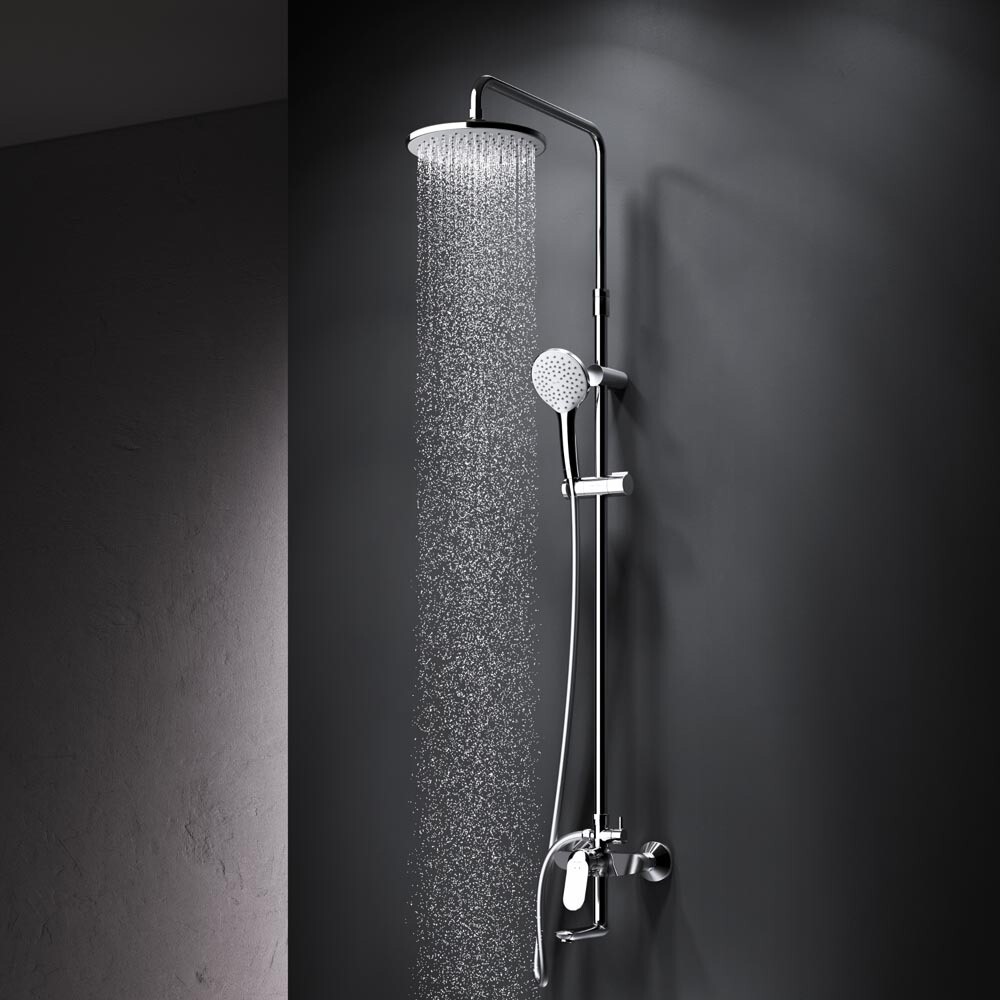 Смеситель выполнен в виде полочки. Увеличенный диаметр душевых леек (верхний душ 220 мм и ручной душ 120 мм) позволит ощутить преимущества тропического душа, тогда как увеличенная длина шланга 1750 мм обеспечит свободу движений во время принятия душа. Телескопическая поворотная штанга регулируется по высоте в диапазоне от 1030 до 1460 мм, обеспечивая комфорт для людей любого роста, а шаровой шарнир в держателе верхнего душа позволяет регулировать угол его наклона. Переключатель расположен за ручкой настройки температуры и позволяет менять источник потока воды от ручной лейки и излива до верхнего душа.
