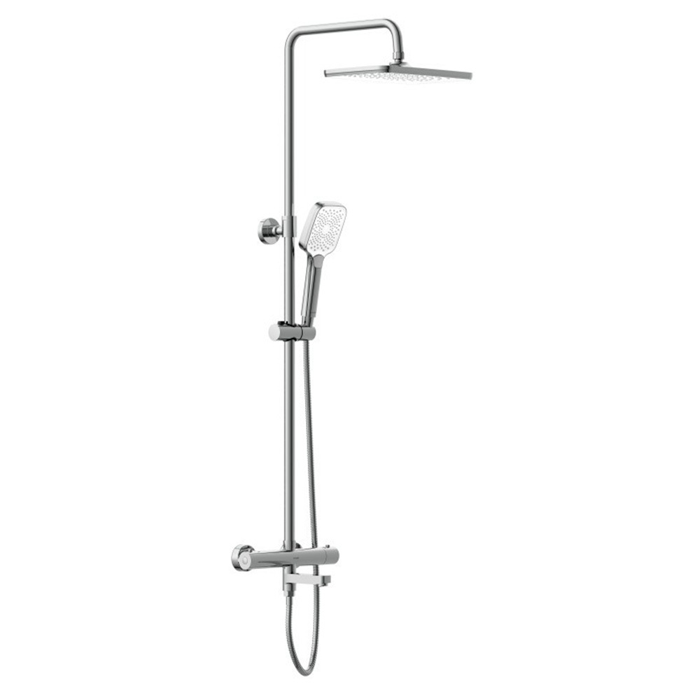 Душевая система Vivo c термостатическим смесителем с изливом, с верхним и ручным душем. Высота телескопической стойки регулируется в диапазоне от 100 до 155 см.