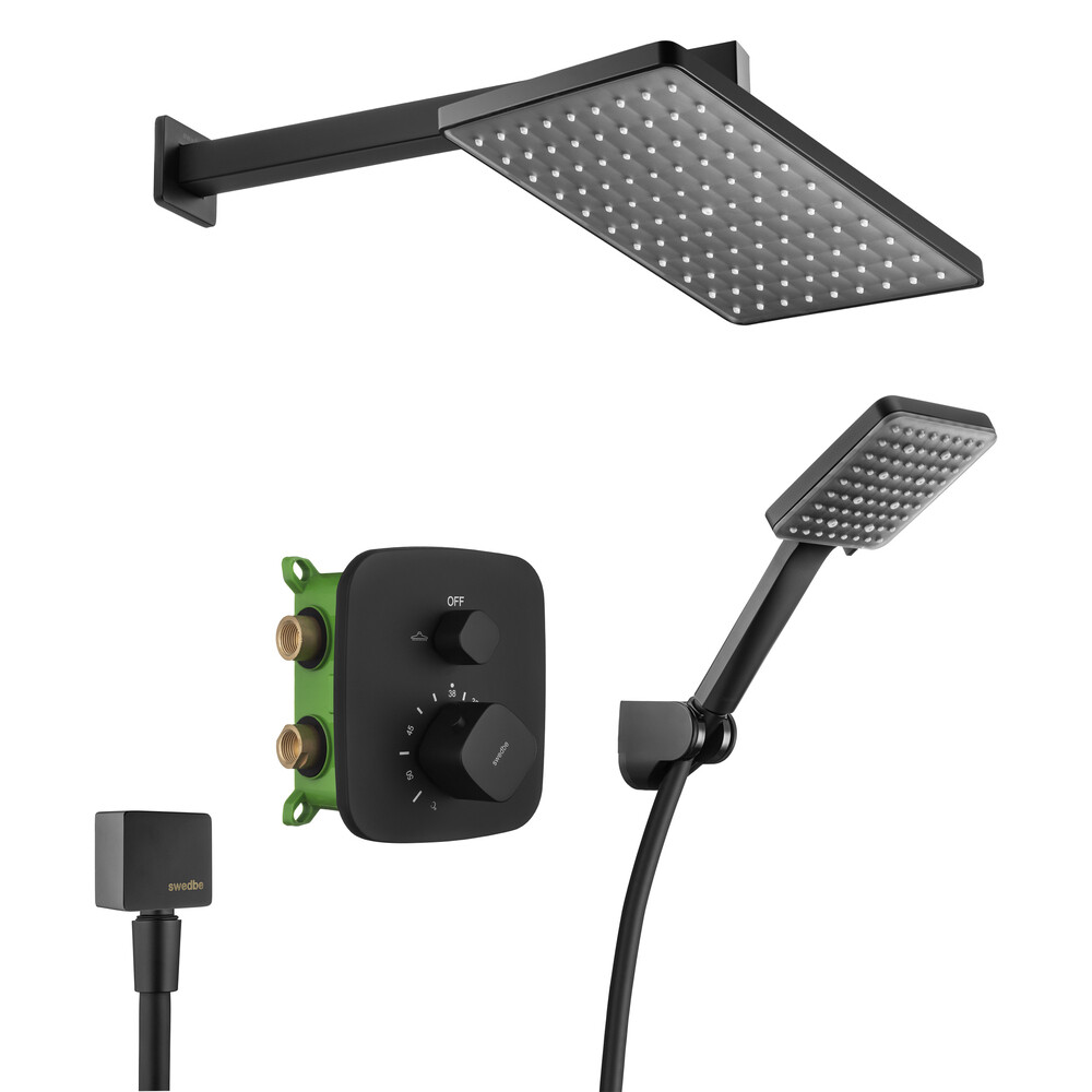 Душевой комплект Swedbe Plattaсо выполнен в стильном черном цвете, который добавит современности и утонченности в любой интерьер. Встраиваемый термостат обеспечивает стабильную температуру воды, что делает ваш душ комфортным и безопасным. Смеситель на 2 выхода позволяет легко переключаться между верхним душем и ручным душем, обеспечивая гибкость в использовании. Широкая головка верхнего душа гарантирует равномерное распределение воды, создавая эффект дождя для максимального расслабления.