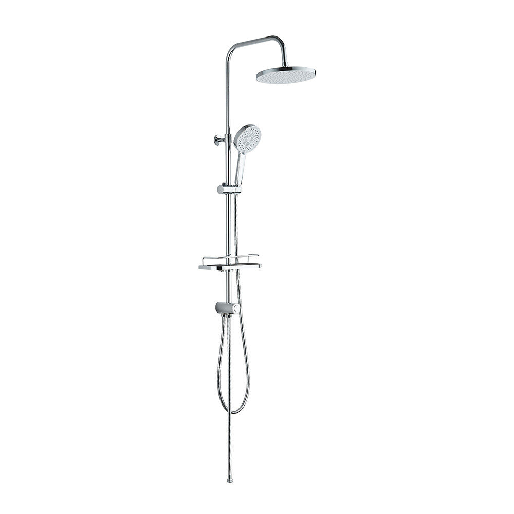 Душевой комплект с верхним душем и полкой цвета хром сочетает в себе современный дизайн и высокое качество.