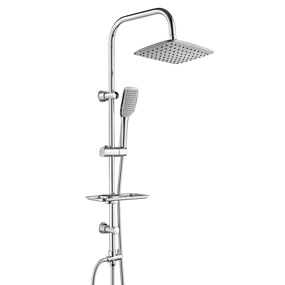 Душевой комплект состоит из верхней и ручной леек, шлангов, штанги и полки. Верхняя лейка регулируется под нужным углом за счет шарнирного крепления. Материалы устойчивы к перепадам температуры и воздействию высокой влажности. Крепления штанги регулируется по высоте для возможности установки в старые отверстия. Ручная и верхняя лейки оснащены форсунками Self-Clean Device для легкой очистки. Шланги с системой против перекручивания в металлизированной оплетке.