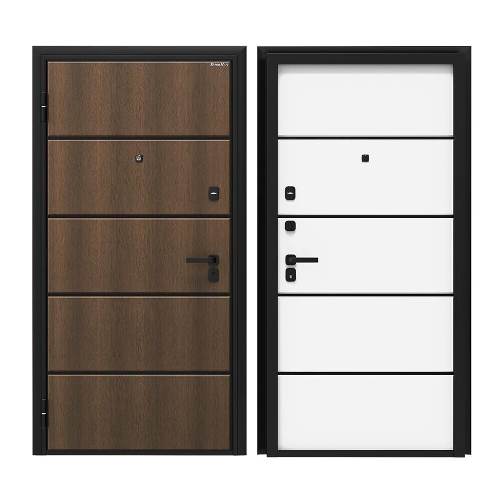 Входная дверь DoorHan Премиум предназначена для покупателей, которые ценят не только технические характеристики, но и привлекательный современный дизайн. Отличительная особенность — дверь полностью изготовлена из холоднокатаной оцинкованной стали толщиной 0,8 мм с использованием технологии бесшовного производства с 2-мя листами металла. В качестве наполнения используется огнестойкая минераловатная плита высокой плотности, заполнение полотна беспустотное. Снаружи МДФ панель Калабрия в коричневом цвете структура «дерево» с системой профилей, изнутри МДФ панель в белом цвете с системой профилей.