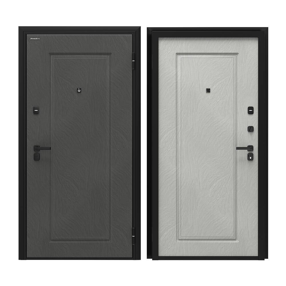 Входная дверь DoorHan Премиум предназначена для покупателей, которые ценят не только технические характеристики, но и привлекательный современный дизайн. Отличительная особенность — дверь полностью изготовлена из холоднокатаной оцинкованной стали толщиной 0,8 мм с использованием технологии бесшовного производства с 2-мя листами металла. В качестве наполнения используется огнестойкая минераловатная плита высокой плотности, заполнение полотна беспустотное. Снаружи МДФ панель Муссон Дюна в темно-сером цвете, изнутри МДФ панель Муссон Норд в светло-сером цвете, фрезеровка Квадро.