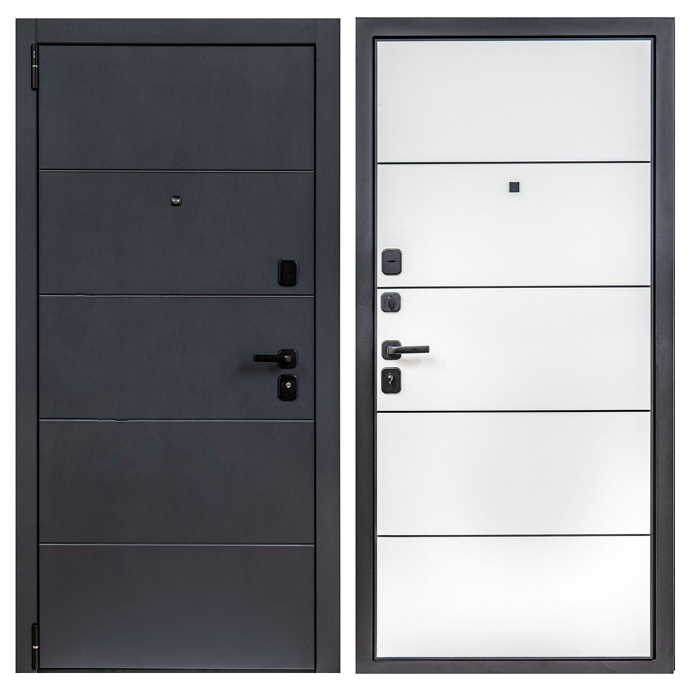 Дверной стальной однопольный блок с открыванием наружу. Дверь предназначена для установки в жилых и общественных зданиях в качестве входной двери внутри помещения. Цельногнутая конструкция полотна и закрытый цельнокатаный профиль коробки. Стальной лист с атмосферостойким порошковым покрытием цвет «Лунный камень» декорированный панелью МДФ 10 мм. С внутренней стороны облицовано царговой МДФ-панелью толщиной 22 мм, цвет «Snow Veralinga». Три горизонтальных усиливающих омега-профиля (ребра) создают единую монолитную жесткость и прочность конструкции. Две наружные петли на опорных подшипниках. Два замка 4-го (высшего) класса взломостойкости. Цилиндровый механизм с вариантом исполнения «ключ-шток», взаимозаменяемый аналогичным вариантом. Встроенные в дверную коробку 3 гильзы из ABS-пластика обеспечивают тихую работу ригелей. Дверь крепится анкерными болтами (в комплект не входят и приобретаются отдельно) или с использованием монтажных пластин (6 шт. в комплекте).