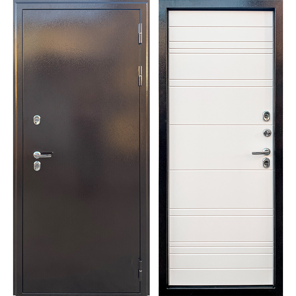 Предназначена для установки в качестве уличной входной двери в частных домах, загородных коттеджах, таунхаусах, на границе улица/дом, в том числе в жилых и общественных зданиях. Полотно изготовлено из стали. С внутренней стороны облицовано фрезерованной МДФ-панелью толщиной 10 мм. Стальной лист 1,2 мм с атмосферостойким порошковым покрытием цвета «антик медный»; панель МДФ, толщиной 10 мм в цвете «белый»; наполнение — базальтовая плита + пенополистирол.