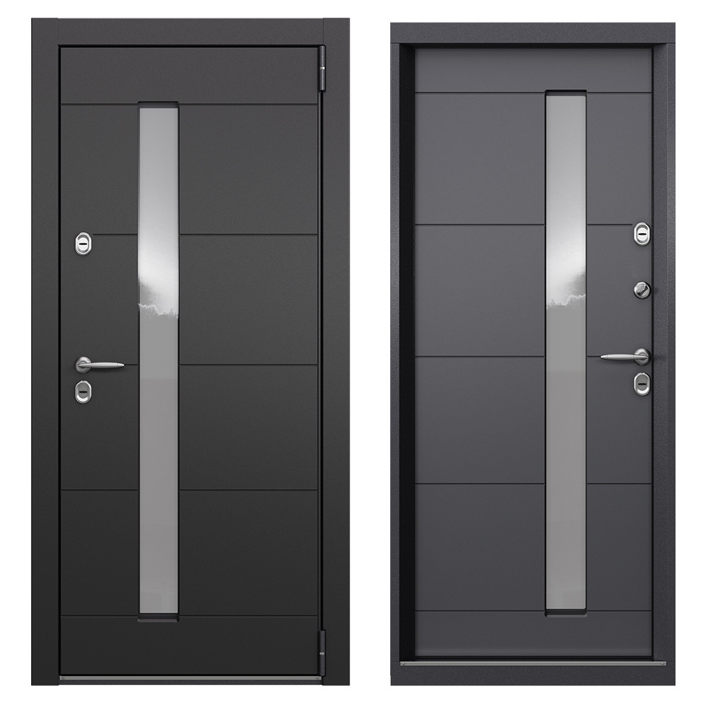 Наполнение полотна — пенополистирол + минеральная плита в ребрах жесткости с терморазрывом — фольгированный пенофол по периметру. Предназначена для установки в качестве уличной входной двери в частных домах, загородных коттеджах, таунхаусах, на границе улица/дом, в том числе в жилых и общественных зданиях. Для дверей, имеющих контакт с улицей, обязательно наличие козырька, защищающего от прямых воздействий осадков и солнечного света. Полотно изготовлено из стали, усиленное вертикальными ребрами жесткости со стеклопакетом. Стальной лист с атмосферостойким порошковым покрытием цвета «Темно-серый букле графит»; панель МДФ с ЛКП с внешней стороны в цвете «Графит», панель МДФ в цвете «Оскуро». Короб — цельногнутый профиль закрытого типа с терморазрывом МДФ 6 мм.
