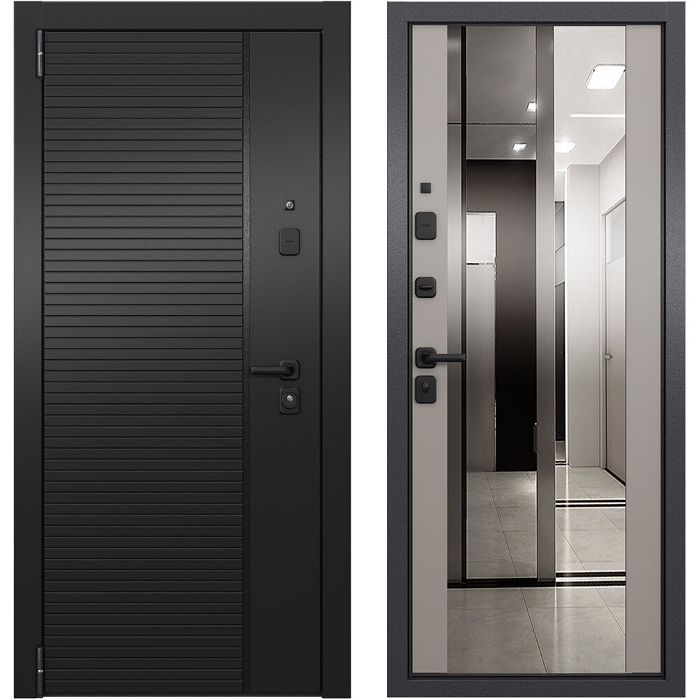 Предназначена для установки в жилых и общественных зданиях в качестве входной двери внутри помещения. Полотно изготовлено из стали. Стальной лист 1,2 мм с атмосферостойким порошковым покрытием цвета «Темно-серый букле графит»; с внешней отделкой МДФ в цвете «Черная шагрень» с декоративной отделкой; с внутренней стороны МДФ в цвете «Крема» с зеркалом. Наполнение — пенополистирол.