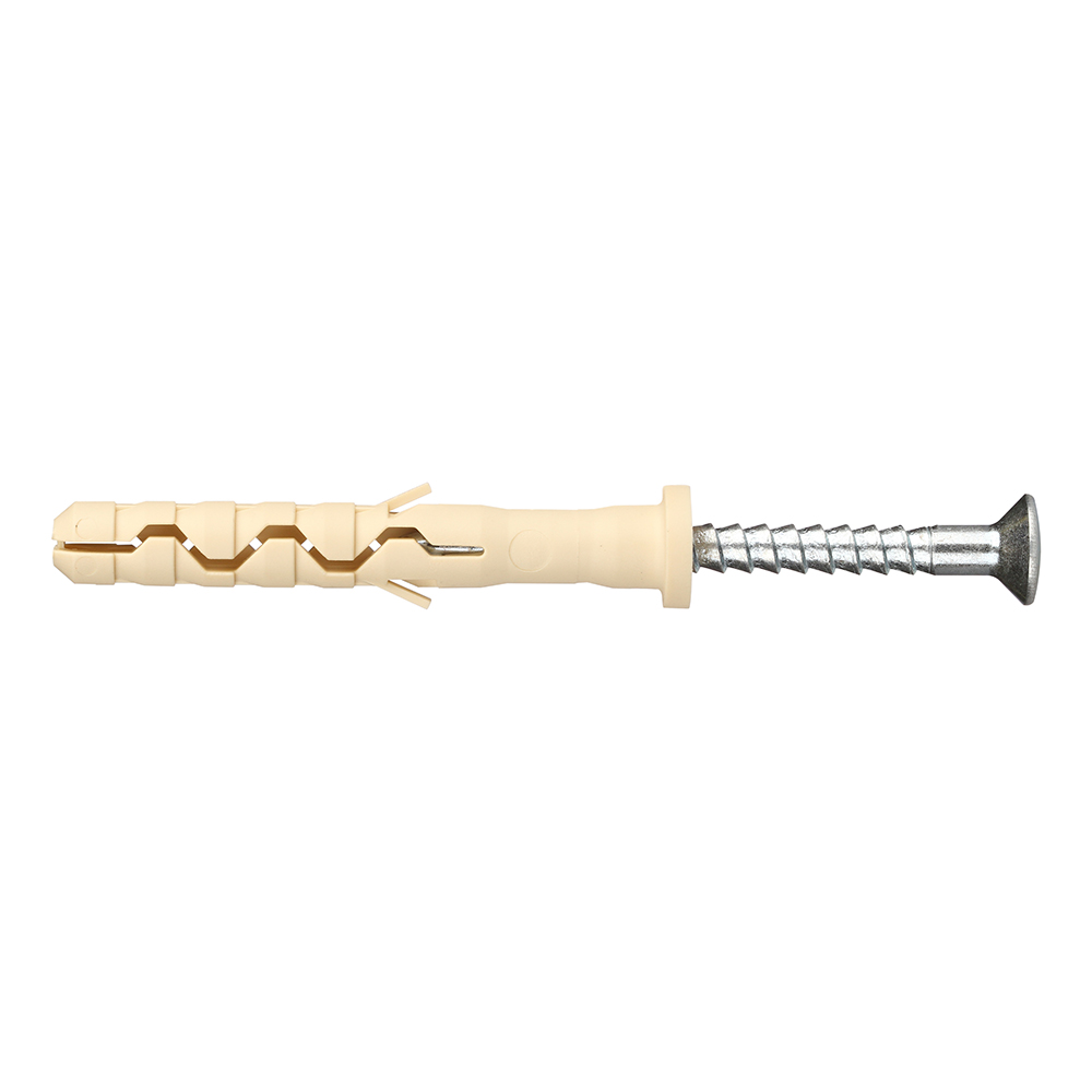 Нейлон обеспечивает надежное сцепление с материалом основания. Резьбовой оцинкованный гвоздь повышенной прочности заранее установлен в дюбель.