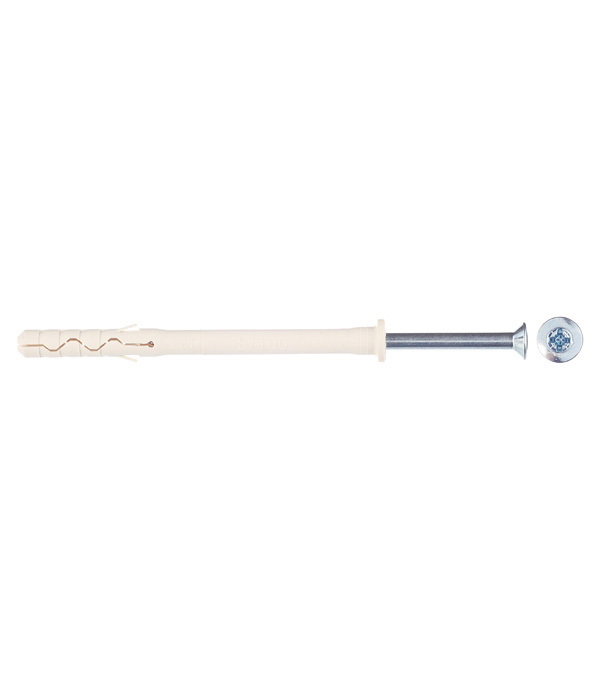 Нейлон обеспечивает надежное сцепление с материалом основания. Резьбовой оцинкованный гвоздь повышенной прочности заранее установлен в дюбель.