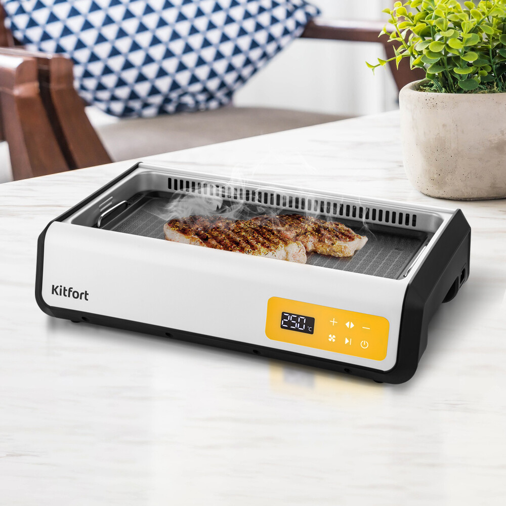 Электрогриль КТ-1686 предназначен для приготовления мяса, рыбы, овощей, сосисок, бутербродов, панини, сэндвичей, гренок, тостов и многих других блюд. На дисплее отображаются температура приготовления и таймер. С помощью сенсорных кнопок вы самостоятельно можете запускать и отключать вентилятор, а также настроить температуру (100, 120, 140, 160, 180, 200, 220, 250°C) и таймер от 20 до 120 минут. Большая площадь поверхности съемных панелей позволяет одновременно жарить много продуктов. У прибора две панели для жарки: с гладкой и ребристой поверхностью. Панель с ребристой поверхностью придает ребристый рисунок и помогает стекать жиру. Вентилятор позволяет удалять из гриля образующийся в процессе готовки дым, что улучшает качество приготовления и препятствует запотеванию крышки.