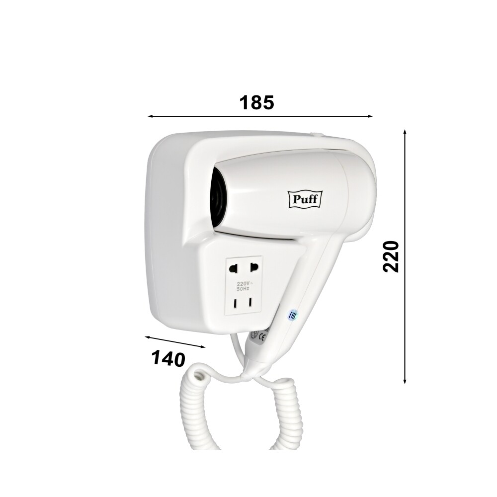 Настенный фен Puff-1200В предназначен для быстрой сушки и комфортной укладки в спорткомплексах, фитнес-центрах, бассейнах, отелях, гостиницах, частных домах и квартирах. Это одна из наиболее доступных моделей, оснащенная дополнительной электророзеткой на корпусе — что делает ее особенно удобной для семейных номеров. Кроме того, фен имеет удобное крепление для установки.