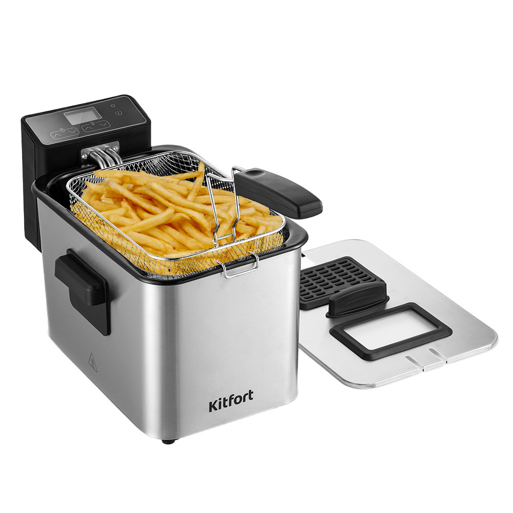 Продукты во фритюрнице Kitfort КТ-4054 готовятся быстрее, чем на сковороде из-за короткого воздействия высокой температуры со всех сторон. Хорошо зажаренные во фритюре продукты покрыты хрустящей корочкой, под которой почти нет масла. Технология «Холодная зона» предотвращает подгорание мелких кусочков продуктов‚ что улучшает вкус приготовленной пищи. Масло при этом будет дольше сохраняться чистым. И его можно использовать до 10-15 раз повторно. С помощью кнопок на панели управления можно устанавливать таймер и температуру приготовления. Время таймера и температура будут отображаться на дисплее устройства. Вы можете выбрать температуру приготовления 130, 150, 170, 190 °C. Конструкция прибора полностью разборная. Чашу, крышку, корзину можно мыть с применением мочалки и моющих средств. У фритюрницы предусмотрено удобное хранение шнура.