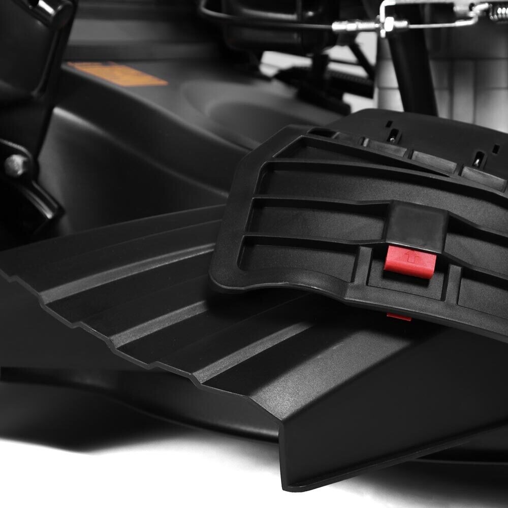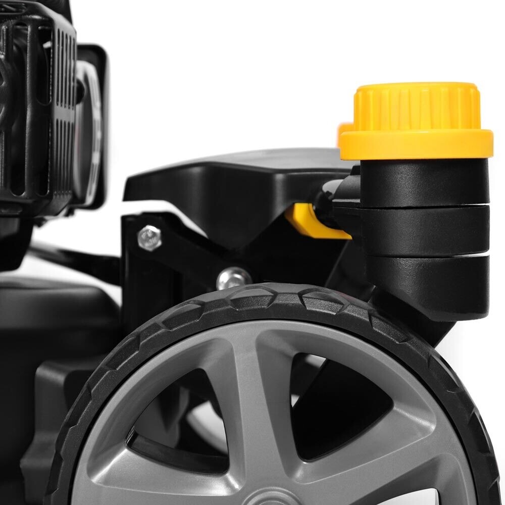 Особенностью этой модели является возможность легкого маневрирования благодаря разблокируемым передним колесам. Это особенно полезно при работе на участках с препятствиями или при необходимости часто менять направление. Присоединенный штуцер для подключения шланга значительно упрощает процесс очистки деки от травы и других загрязнений, что экономит время и усилия.