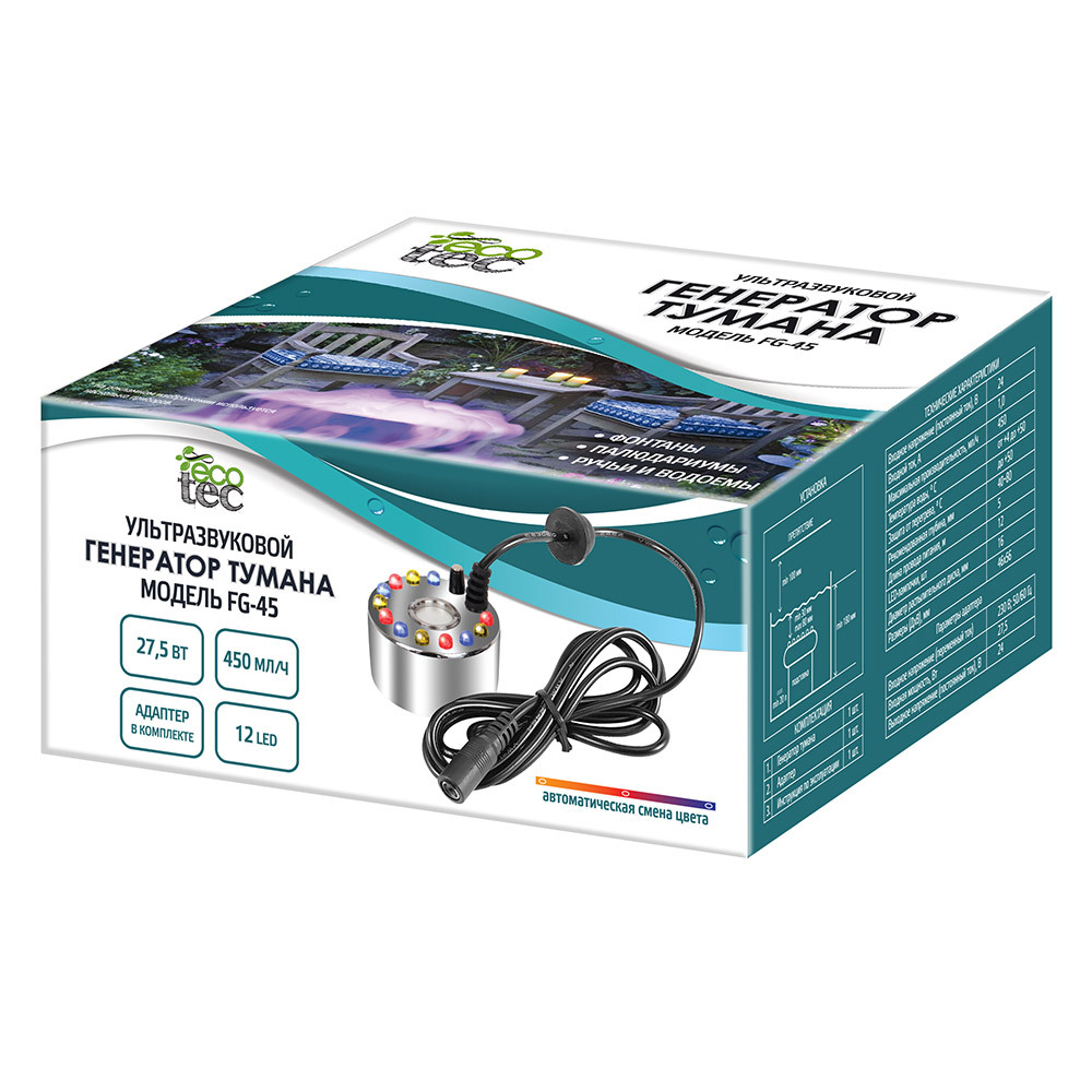 Генератор тумана Ecotec используется для создания декоративных ландшафтных композиций в садовых прудах, водопадах и прочих водоемах. Внутри помещений можно использовать как увлажнитель воздуха и для ароматерапии, добавив несколько капель аромамасла в воду. Прибор оснащен 12 LED-лампочками, которые автоматически загораются при попадании в воду. Смена цвета лампочек создает уютную атмосферу.