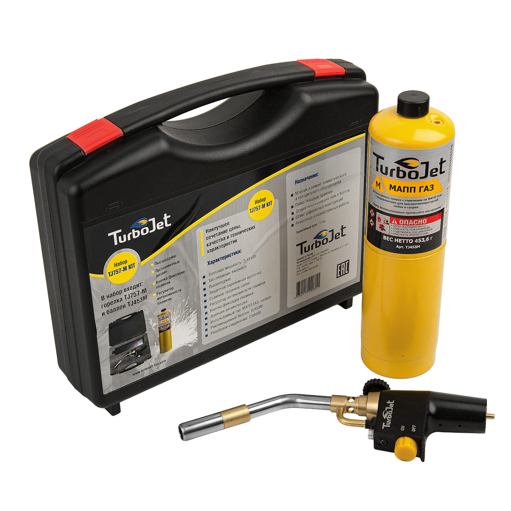 Комплектация: Горелка TJ757-M, баллон TJ453M с МАПП газом, пластиковый кейс.