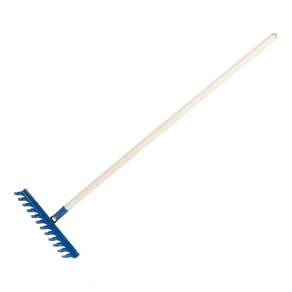 Грабли предназначены для разравнивания и рыхления почвы на участке, уборки опавших листьев, сорняков и сухой травы. Оборудованы деревянным черенком, имеют 12 витых зубьев.