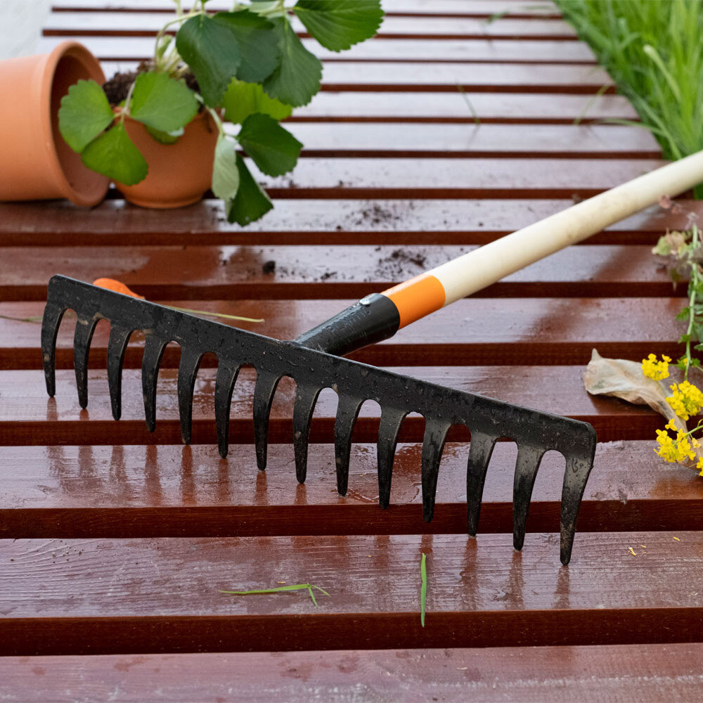 Универсальные грабли с деревянным черенком Plantic Terra с 12 зубцами подходят для рыхления, аэрации и выравнивания почвы.