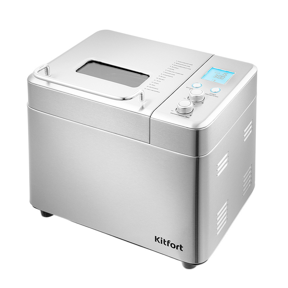 Хлебопечь КТ-304 позволяет готовить различные виды хлеба, джемы и десерты, йогурты, а также различные виды теста. Она имеет стильный металлический корпус и обладает всеми прогрессивными функциями для удобного и приятного процесса приготовления. С помощью 15 автоматических программ вы легко приготовите вкусную домашнюю выпечку, ржаной хлеб, сдобу, йогурт, джем или десерты, замесите тесто на пироги или пиццу. Вы можете начать приготовление в более позднее время, используя функцию отложенного старта, или наоборот, воспользоваться программой ускоренной выпечки. Хлебопечь снабжена функцией выбора веса готового продукта и цвета корочки в соответствии с вашими вкусовыми предпочтениями. В крышку установлен автоматический дозатор для добавления в выпечку дополнительных ингредиентов во время приготовления. Хлебопечь обладает энергонезависимой памятью. При отключении электропитания во время работы программы приготовления, настройки сохраняются в памяти прибора в течение 10 минут. При возобновлении электропитания выполнение программы продолжится автоматически. Если электропитание отсутствует более 10 минут — настройки сбрасываются, и вам необходимо будет запустить программу заново. Функция поддержания температуры готовых блюд сохраняет выпечку свежей и горячей в течение одного часа после завершения работы автоматической программы.