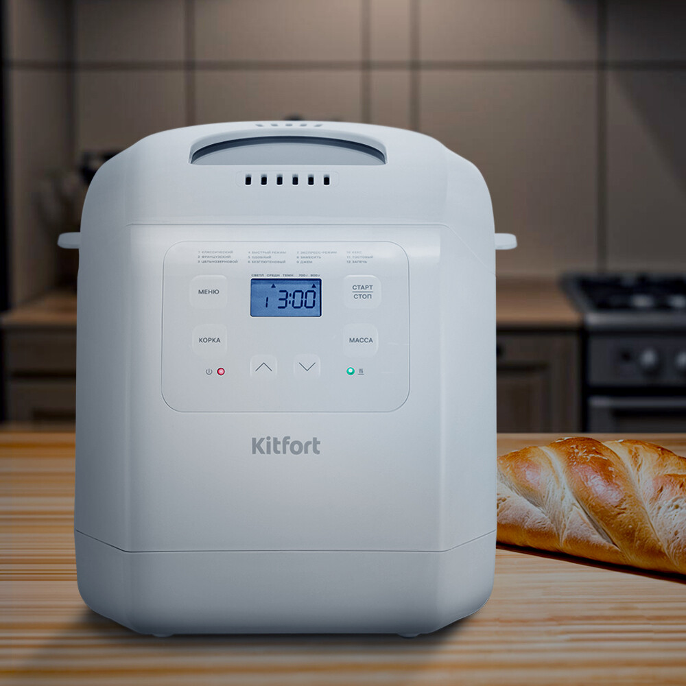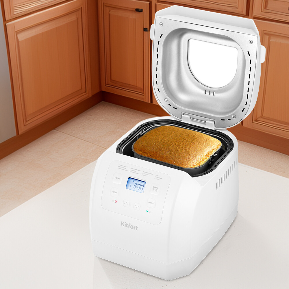 Хлебопечь КТ-312 позволяет готовить различные виды хлеба, джем и кексы, а также тесто. Корпус прибора сделан из пластика.