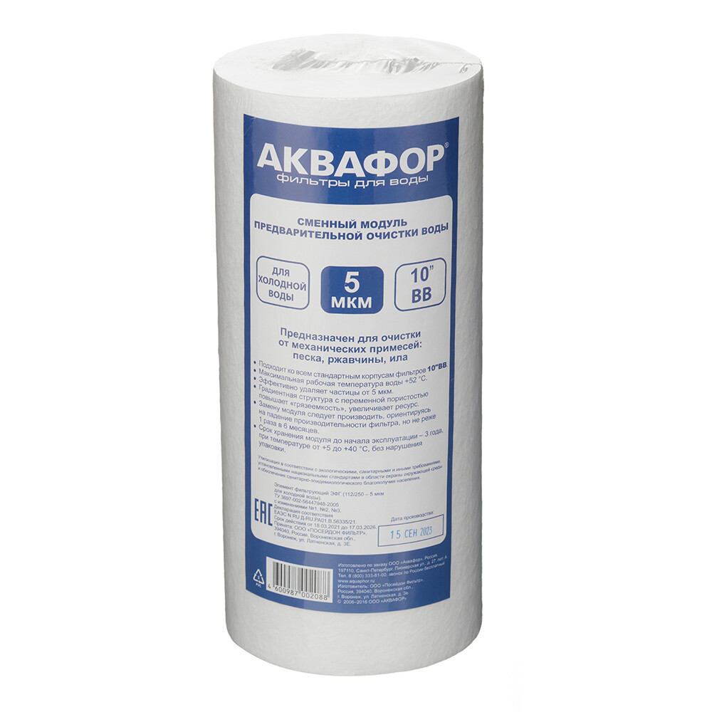 Предназначен для очистки воды. Устанавливается в корпус водоочистителя для холодной воды Аквафор и другие водоочистители со стандартным картриджем BigBlue 254 мм. (10»). Удаляет мелкие (до 5 мкм.) механические примеси, такие как грязь, песок и ржавчина, снижает мутность воды.