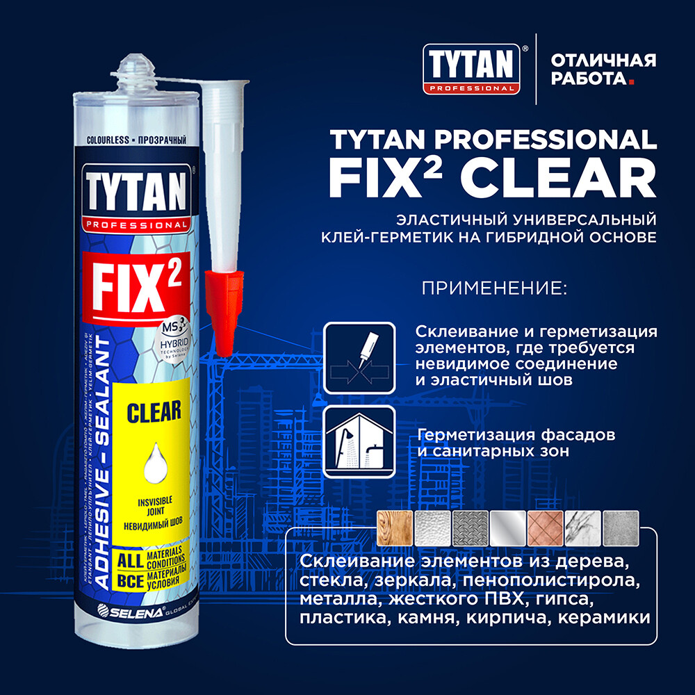 Однокомпонентный полностью прозрачный гибридный клей-герметик на основе MS-полимера, не содержит фталатов. 2 в 1: клеит и герметизирует. Это универсальный продукт с широким спектром применения.