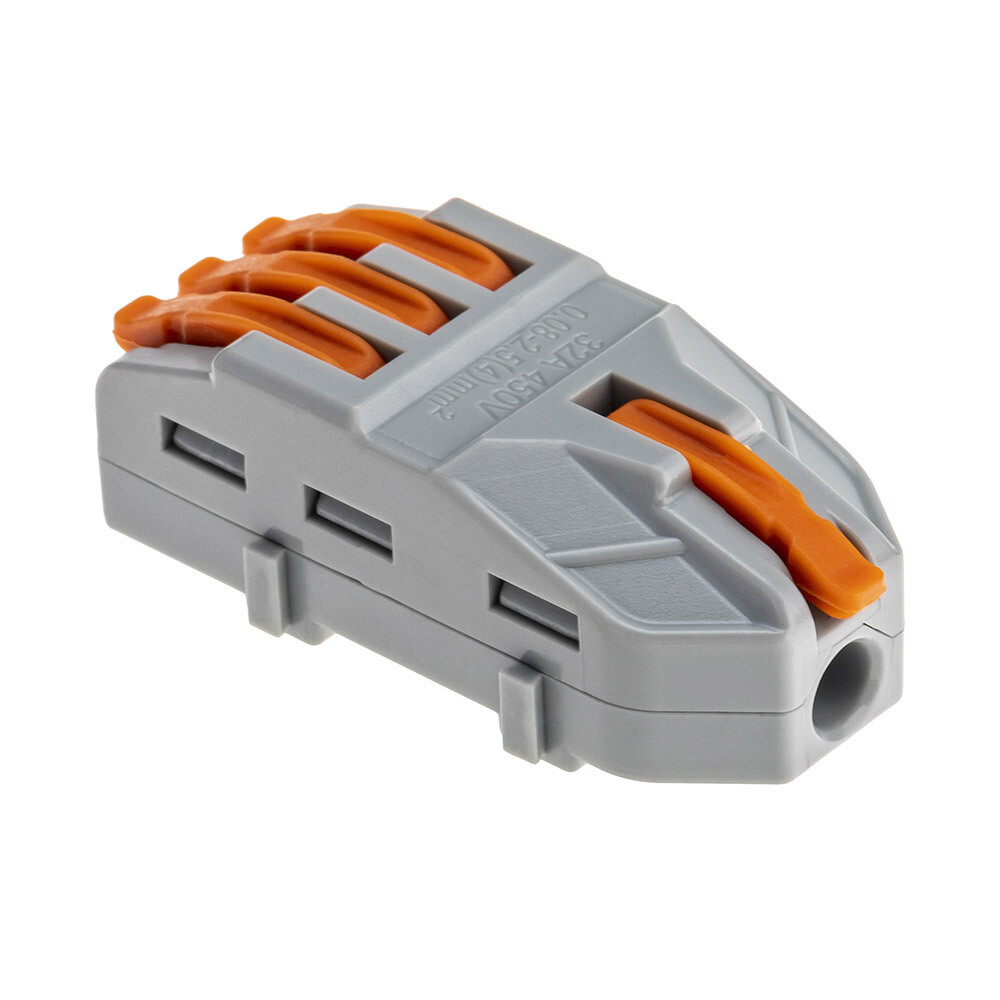 Разветвительные рычажковые клеммы 1х3 Duwi являются полным аналогом клемм Wago/Ваго. Клеммы подходят для соединения моножильных и многожильных медных проводов, защищая их от повреждения и исключая возможность замыкания. Моножильные провода достаточно только зачистить, а многожильные — нужно обжать наконечником для наилучшего соединения контактов. Рычажки предназначены для надежного зажима кабелей. Клеммы используются в цепях переменного и постоянного тока с напряжением до 450В. Номинальный ток: 32 А. Клеммы обладают следующими преимуществами: простое и быстрое подключение, монтаж без инструментов, многократное использование, улучшенная токовая проводимость зажимов, подходят для жесткого и гибкого кабеля, а также для многожильных кабелей (Сечение жесткого проводника от 0,08 до 4 мм2). Клеммы Duwi выполнены из негорючих материалов — термостойкий пластик, а контакты из луженой меди, специальные пазы в корпусе исключают возможность случайного отсоединения проводников. Клеммы имеют 1 ввод и 3 вывода. Рабочая температура составляет от -25С до +85С. Набор клемм из 4 штук упакован в пакет с многоразовым замком, который легко открыть и закрыть. Это позволит сохранить порядок при ремонтных работах и при хранении клемм.