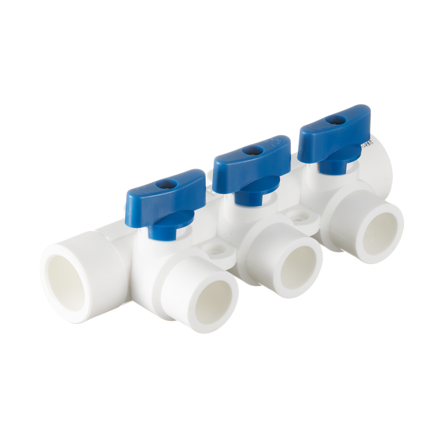 Предназначен для распределения потока жидкости по контурам отопления или водоснабжения. Позволяет сразу вварить трубу из PP-R.