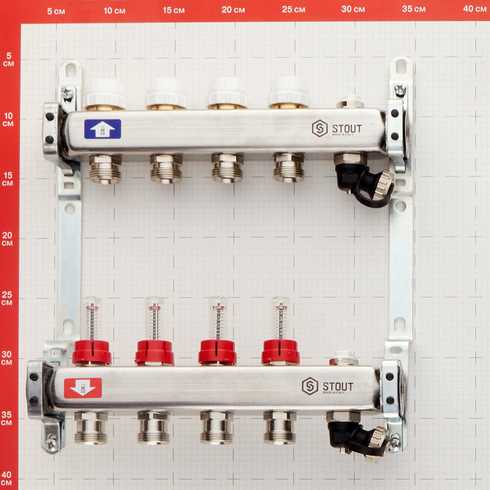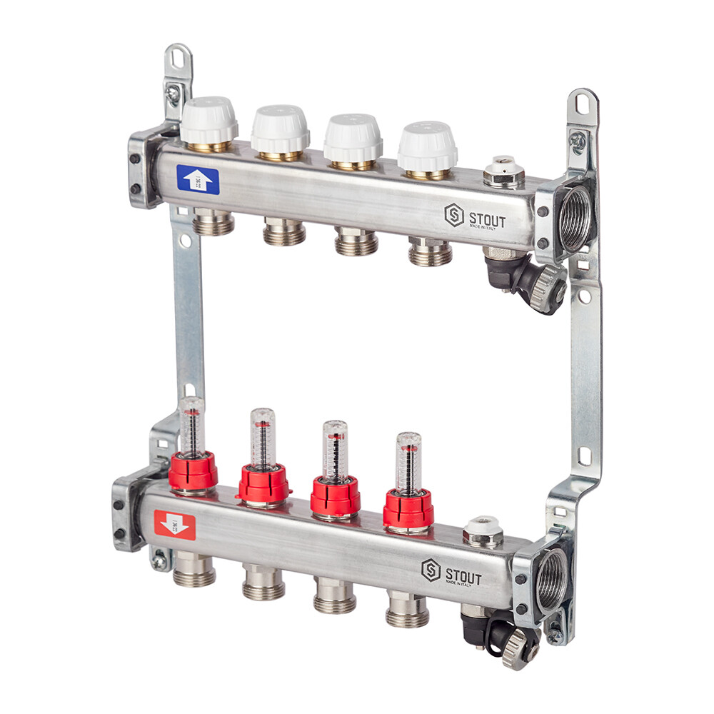 Коллекторная группа с расходомерами нержавеющая сталь Stout 1 ВР(г) х 4 выхода 3/4 НР(ш) ЕК х 1 ВР(г)