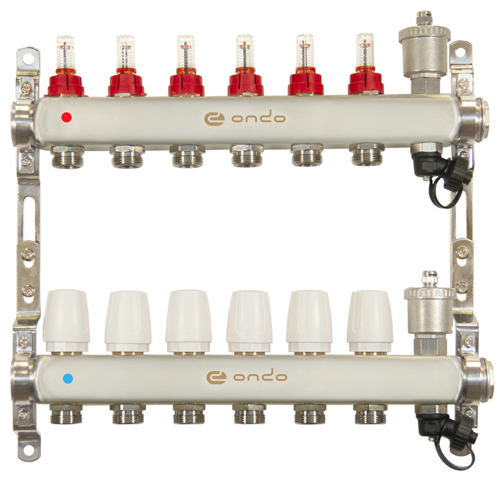 Коллекторная группа ONDO из нержавеющей стали предназначена для оптимизации, контроля и распределения теплоносителя в системах радиаторного и напольного отопления. Коллекторная группа — важный элемент водяного теплого пола. Благодаря ей происходит смешивание горячей и холодной жидкости. Такая особенность позволяет произвести регулировку температуры теплого пола и контролировать его работу. Коллекторная группа ONDO может работать на водяном, либо этиленгликолевом теплоносителе с максимальным содержанием гликоля не более 45%. Коллекторная группа поставляется предварительно в собранном виде. Автоматический воздухоотводчик и дренажный кран встроены в корпус. Материал корпуса — нержавеющая сталь. Установочные кронштейны входят в комплект. Насосно-смесительный узел приобретается отдельно. Данная модификация построена на использовании расходомеров и термостатических клапанов. Детали коллекторной группы соединены между собой на заводе с помощью уплотнительных колец и герметизированы специальным анаэробным клеем. Это позволяет отказаться от дополнительных герметизирующих и уплотнительных материалов при установке. Изделие соответствует требованиям ГОСТ 12.2.063–2015.
