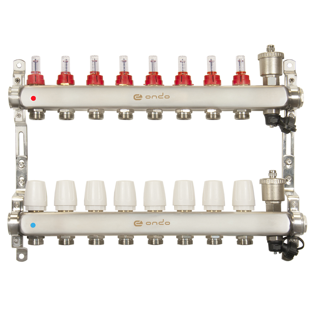 Коллекторная группа ONDO из нержавеющей стали предназначена для оптимизации, контроля и распределения теплоносителя в системах радиаторного и напольного отопления. Коллекторная группа — важный элемент водяного теплого пола. Благодаря ей происходит смешивание горячей и холодной жидкости. Такая особенность позволяет произвести регулировку температуры теплого пола и контролировать его работу. Коллекторная группа ONDO может работать на водяном, либо этиленгликолевом теплоносителе с максимальным содержанием гликоля не более 45%. Коллекторная группа поставляется предварительно в собранном виде. Автоматический воздухоотводчик и дренажный кран встроены в корпус. Материал корпуса — нержавеющая сталь. Установочные кронштейны входят в комплект. Насосно-смесительный узел приобретается отдельно. Данная модификация построена на использовании расходомеров и термостатических клапанов. Детали коллекторной группы соединены между собой на заводе с помощью уплотнительных колец и герметизированы специальным анаэробным клеем. Это позволяет отказаться от дополнительных герметизирующих и уплотнительных материалов при установке. Изделие соответствует требованиям ГОСТ 12.2.063–2015.